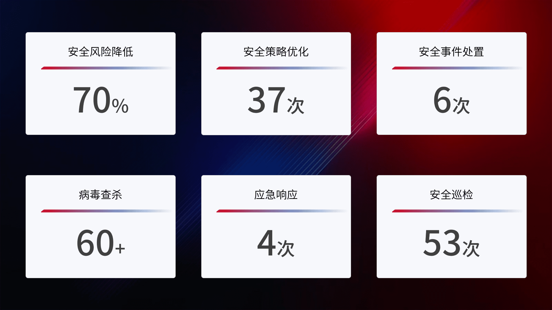 提供全面的安全事件报告体系,,包括处置报告、、、、周报、、季度和年度总结,,结合持续监控,,帮助客户深入了解网络安全状况。。