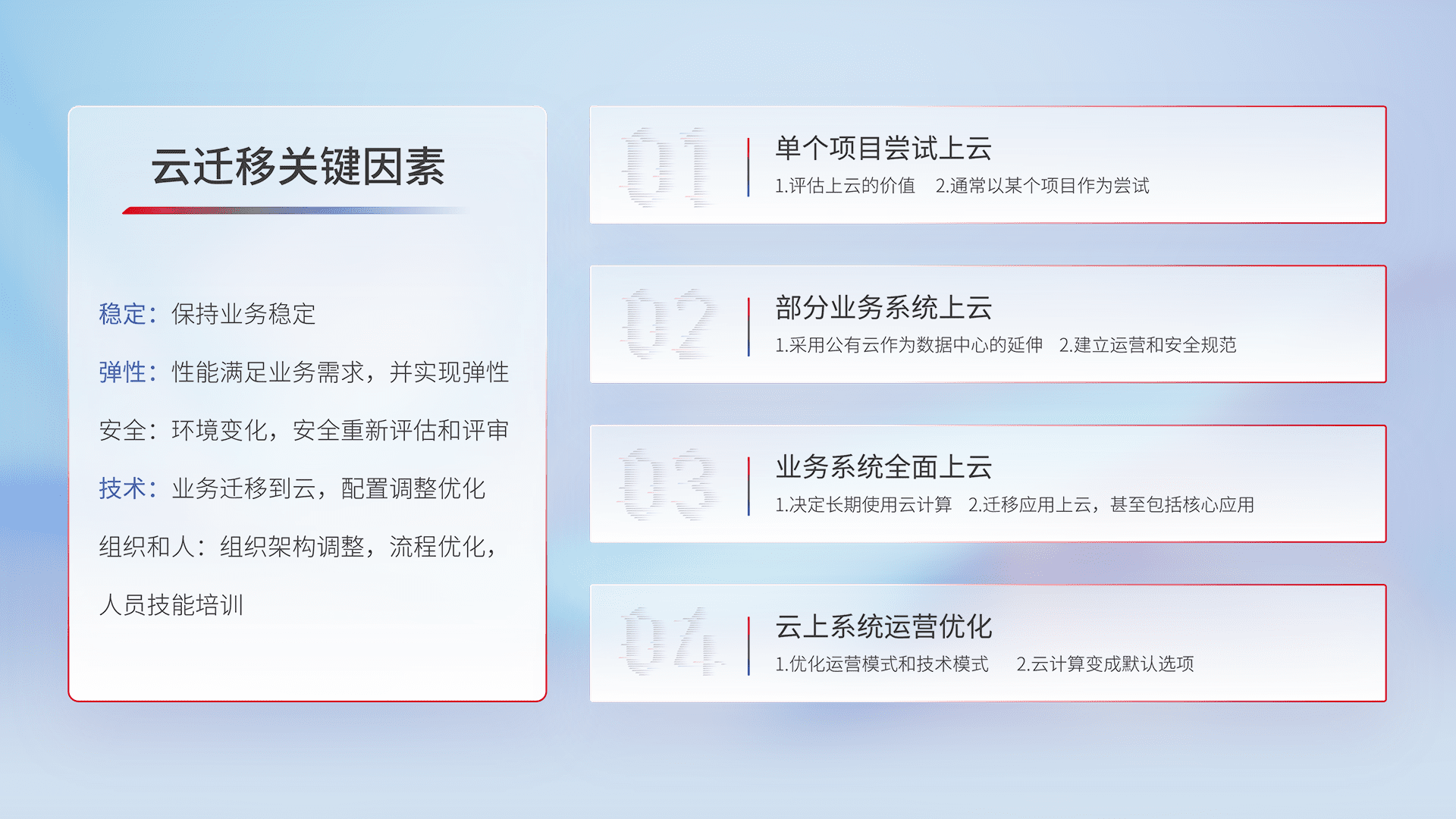 结合实际业务,,,从规划设计、、、云平台选型、、、云原生改造、、、、数据迁移、、集成交付,,,迁移全过程为客户识别最佳上云路径,,,做好风险识别管理,,设计网络架构、、身份权限、、安全审计合规、、操作审计、、、、日志审计、、、监控告警策略、、、多站点容灾设计等,,,对云上基础设施进行整体规划,,,,提升IT治理水平,,,以满足弹性、、高可用、、、高性能的需求。。。