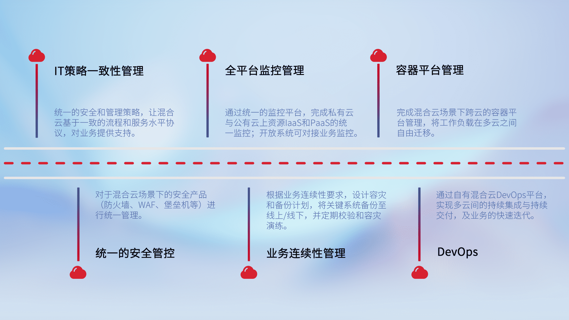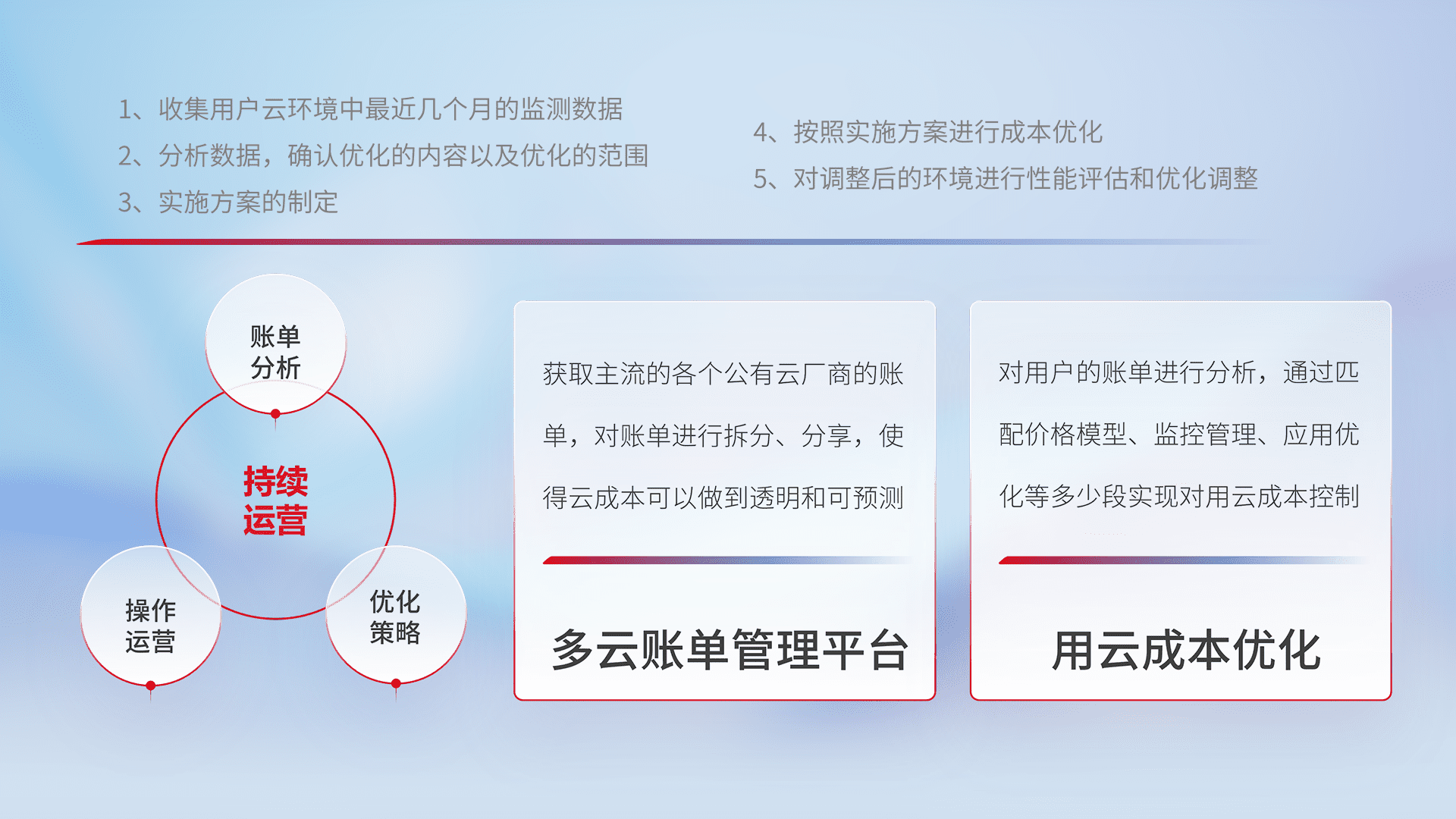 通过多云纳管,,,以统一的资源数据模型把客户的云资源进行抽象和封装,,,,进而实现对多云资源的统一操作,,,保障云资源管理的可靠性、、稳定性与可用性。。。量身定制化运维内容,,配置、、开发运维、、、补丁管理、、、备份、、、监控、、认证和访问管理、、、、审计和日常巡检等,,,保障在用云过程中的可靠度,,,稳定度以及高可用率。。。。
